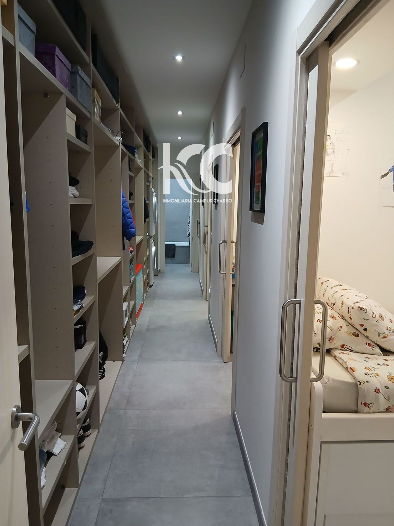 Los armarios empotrados en el pasillo ofrecen un espacio extra para mantener todo organizado.